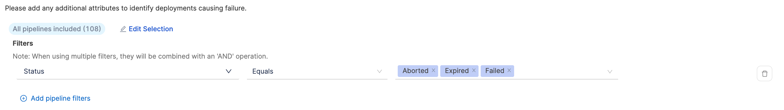 Configure additional attributes to identify deployments that result in failure. By default, all pipelines are included, but you can customize the selection by manually specifying which pipelines should be included.