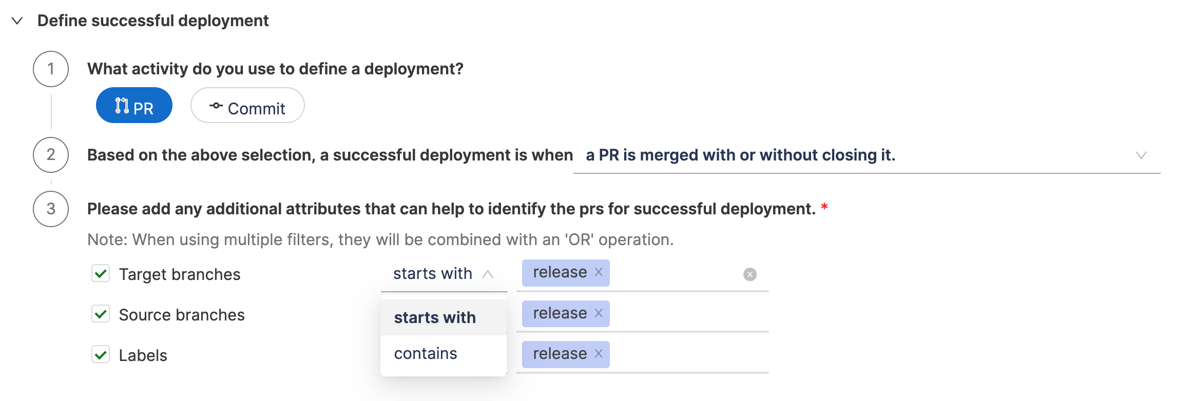Add any extra attributes that help identify PRs for deployments causing failure. Multiple filters are combined using an 'OR' operation.