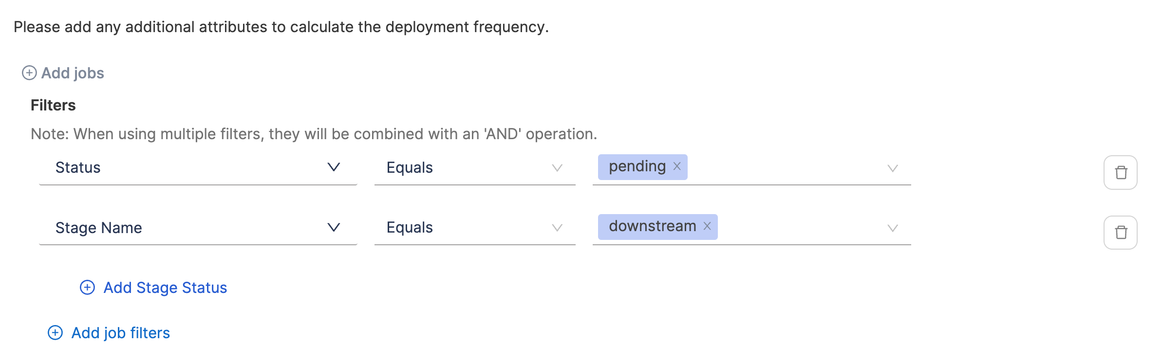 - Define additional attributes to identify deployments causing failure and total deployments. When using multiple filters, they will be combined with an 'AND' operation.