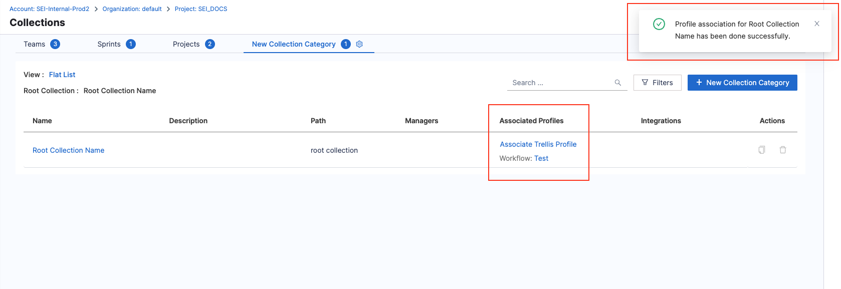 - To associate a DORA profile with the existing Collections, click on the Associate Workflow Profile option under the Associated Profiles column.