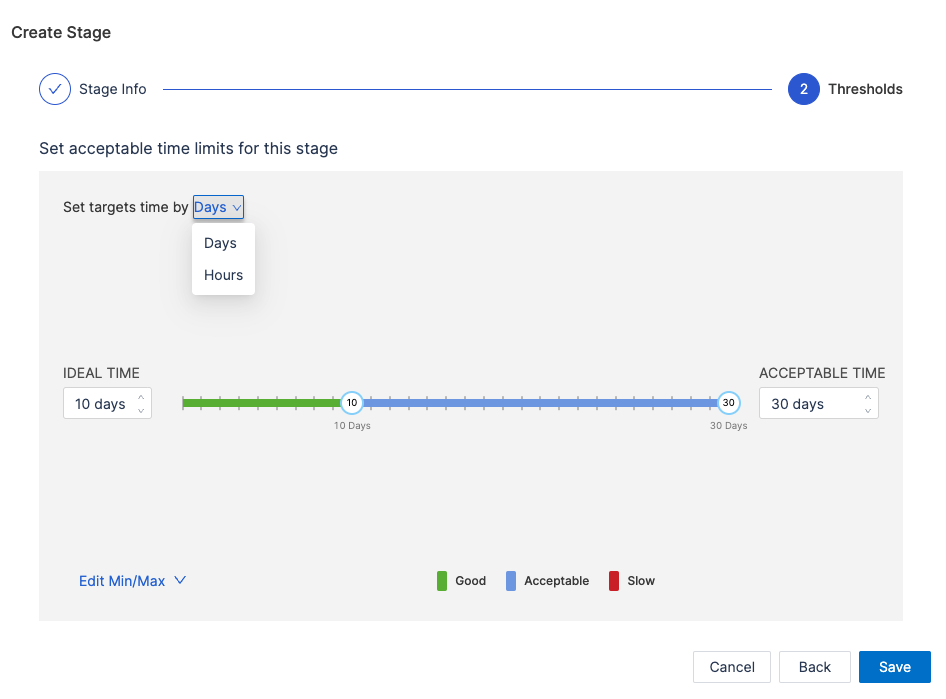- Set acceptable time ranges for the stage, such as Ideal Time and Acceptable Time.