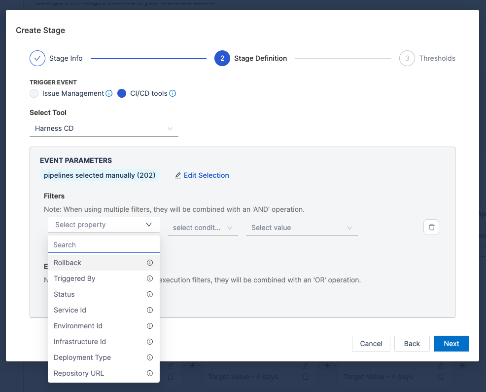 - Refine the calculation by specifying detailed filters. This filters pipelines that should contribute to the change failure rate calculations.
